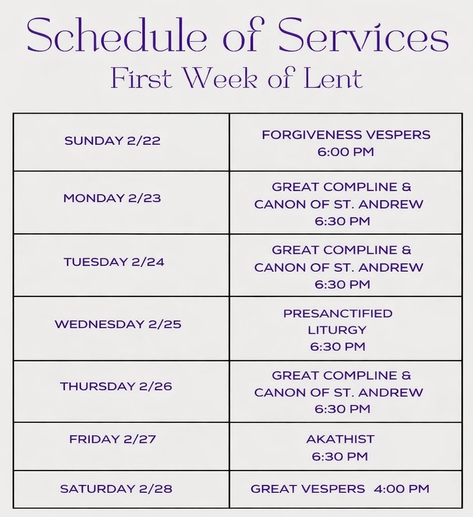 Please join us in our journey to Pascha as we begin Lent with beautifully profound services every night during the first week of the Great Fast
